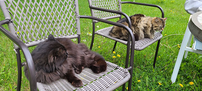 We have a couple of garden supervisors. Sphinx and Shrimp are very good at holding down the chairs. We usually have to find a couple of others if we want to sit near them. LOL
